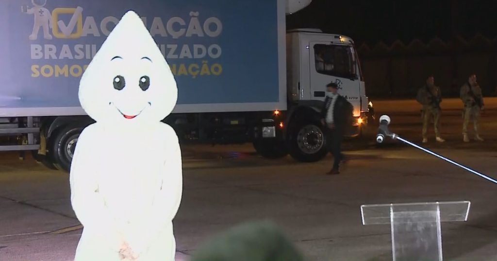 Enquanto aguardavam o desembarque da carga, os cinegrafistas filmaram o garoto-propaganda da vacinação no Brasil, o Zé Gotinha, “abandonado” no aeroporto.