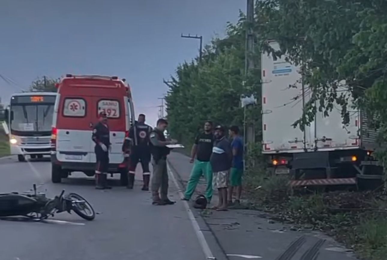 Um acidente envolvendo um caminhão-baú e uma motocicleta foi registrado na madrugada desta sexta-feira (8) na RN-160, em Macaíba, sentido São Gonçalo do Amarante.