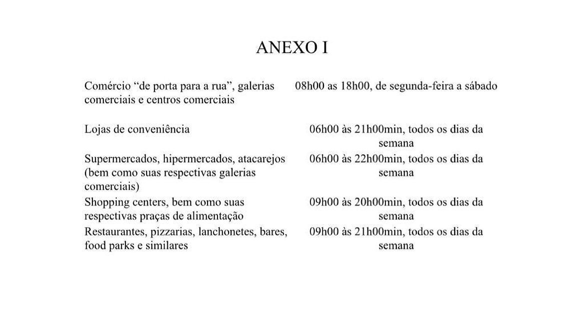 O comércio de porta de rua, as galerias comerciais e os centros comerciais e shoppings, restaurantes, pizzarias, bares e afins, bem como lojas de conveniência, supermercados, hipermercados, atacarejos poderão funcionar nos seguintes horários: