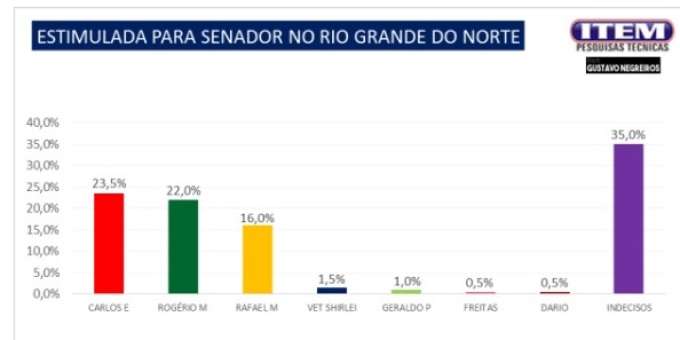 A pesquisa Blog Gustavo Negreiros/Instituto Item estimulada para o Senado mostra empate técnico entre o ex-prefeito de Natal, Carlos Eduardo Alves, 23,5%, e o ex-ministro Rogério Marinho com 22%.