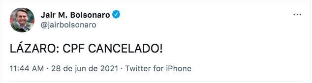Bolsonaro usa meme para celebrar morte de Lázaro: “CPF cancelado”