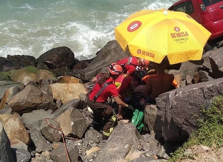 Carro cai em pedras da Ponta do Morcego e mulher é resgatada pelos Bombeiros