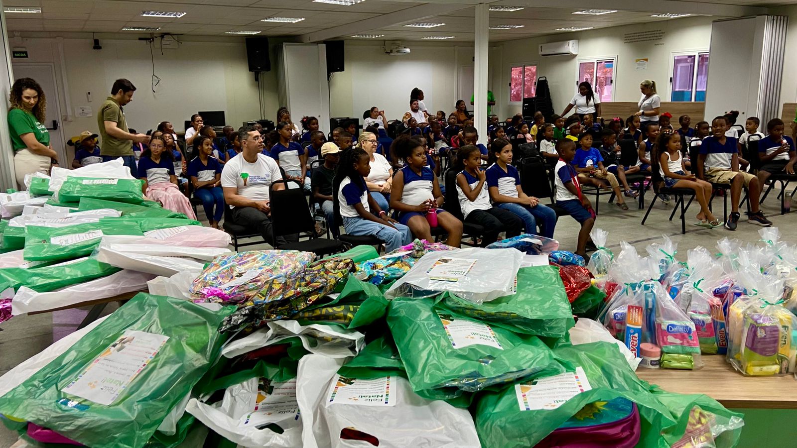 Olhares curiosos, ansiedade a mil e a alegria de ganhar tudo novo para o ano escolar 2026. Quase 100 crianças da Comunidade Quilombola Capoeiras dos Negros, em Macaíba, foram apadrinhadas por voluntários da Neoenergia Cosern através da Árvore da Solidariedade 2025. Mochilas, cadernos, canetas, coleções e brinquedos novos foram doados nesta segunda-feira (22) a estudantes da Educação Infantil e do Ensino Fundamental da Escola Municipal Santa Luzia, em uma ação em parceria com o Instituto Santos Dumont (ISD) e a JR Telétrica.