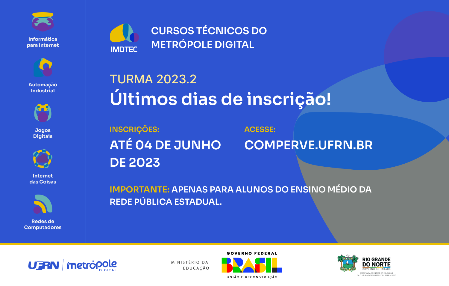 As inscrições para o ingresso nos Cursos Técnicos em Tecnologia da Informação (TI) do Instituto Metrópole Digital (IMD/UFRN) seguem abertas somente até domingo, dia 4 de junho. As vagas são distribuídas para Natal e cidades do interior do Rio Grande do Norte.