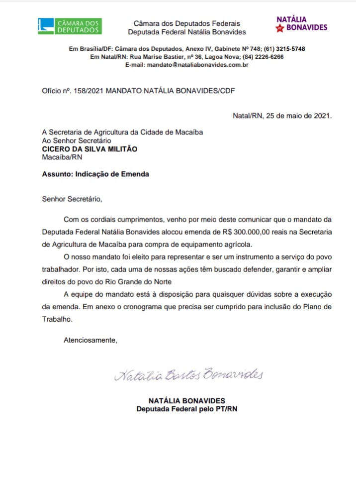 A deputada federal Natália Bonavides (PT) destinou uma emenda no valor de R$ 300 mil reais para a secretaria de Agricultura de Macaíba, para compra de equipamento agrícola.
