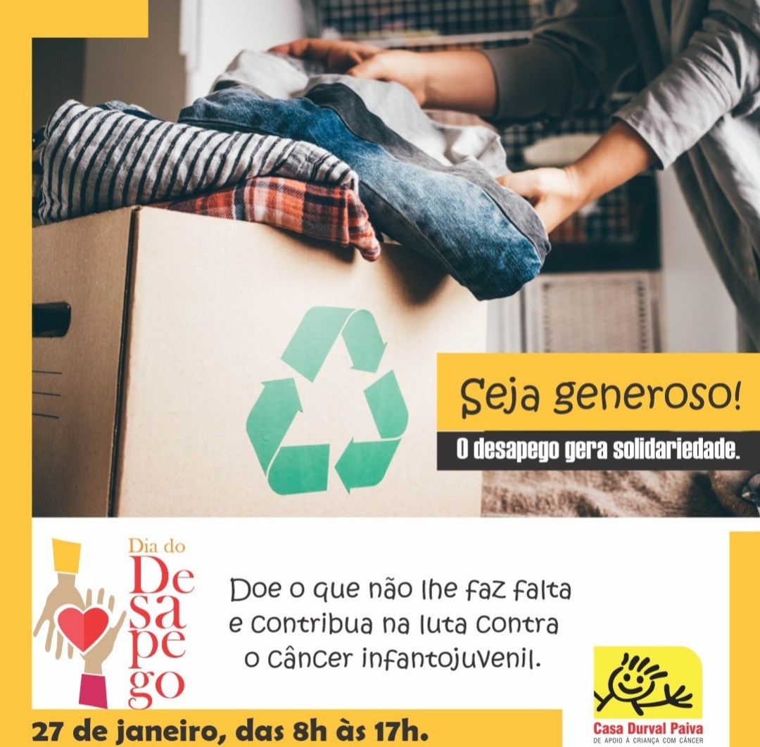 A luta contra o câncer infantojuvenil e doenças hematológicas crônicas continua e você pode contribuir, através da doação de itens em bom estado de conservação e que não sejam mais de seu uso. Nesta sexta-feira (27), das 8h às 17h, a Casa Durval Paiva estará realizando o Dia do Desapego.