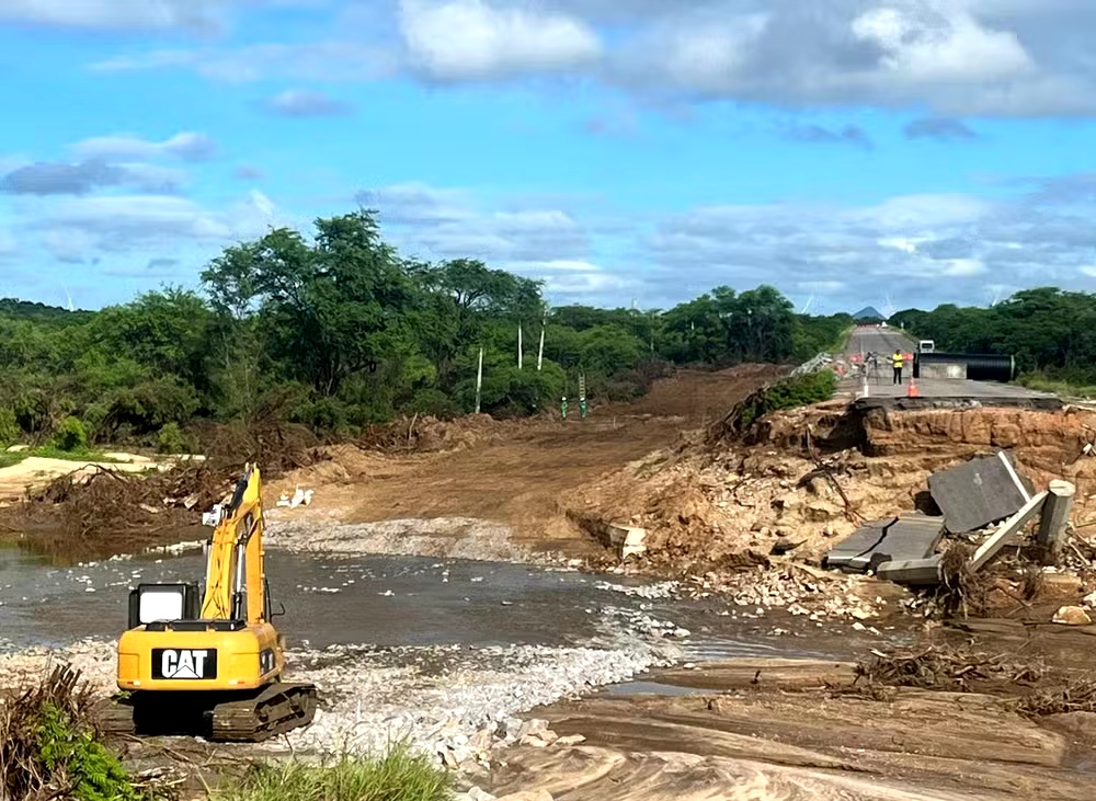 O órgão informou que realizou no trecho serviços como a limpeza da área, regularização do subleito e terraplenagem. Até está terça (23), o Dnit estava colocando uma camada drenante com pedra rachão e brita graduada, e também instalava a tubulação de um bueiro para o fluxo do rio.
