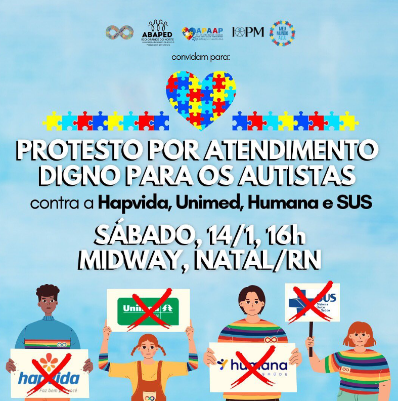 Pais e familiares de crianças e adolescentes com Transtorno do Espectro Autista (TEA) realizam um protesto neste sábado (14), às 16h, na calçada do Midway Mall, em Natal. O ato reivindica atendimento digno nos planos de saúde para os autistas.