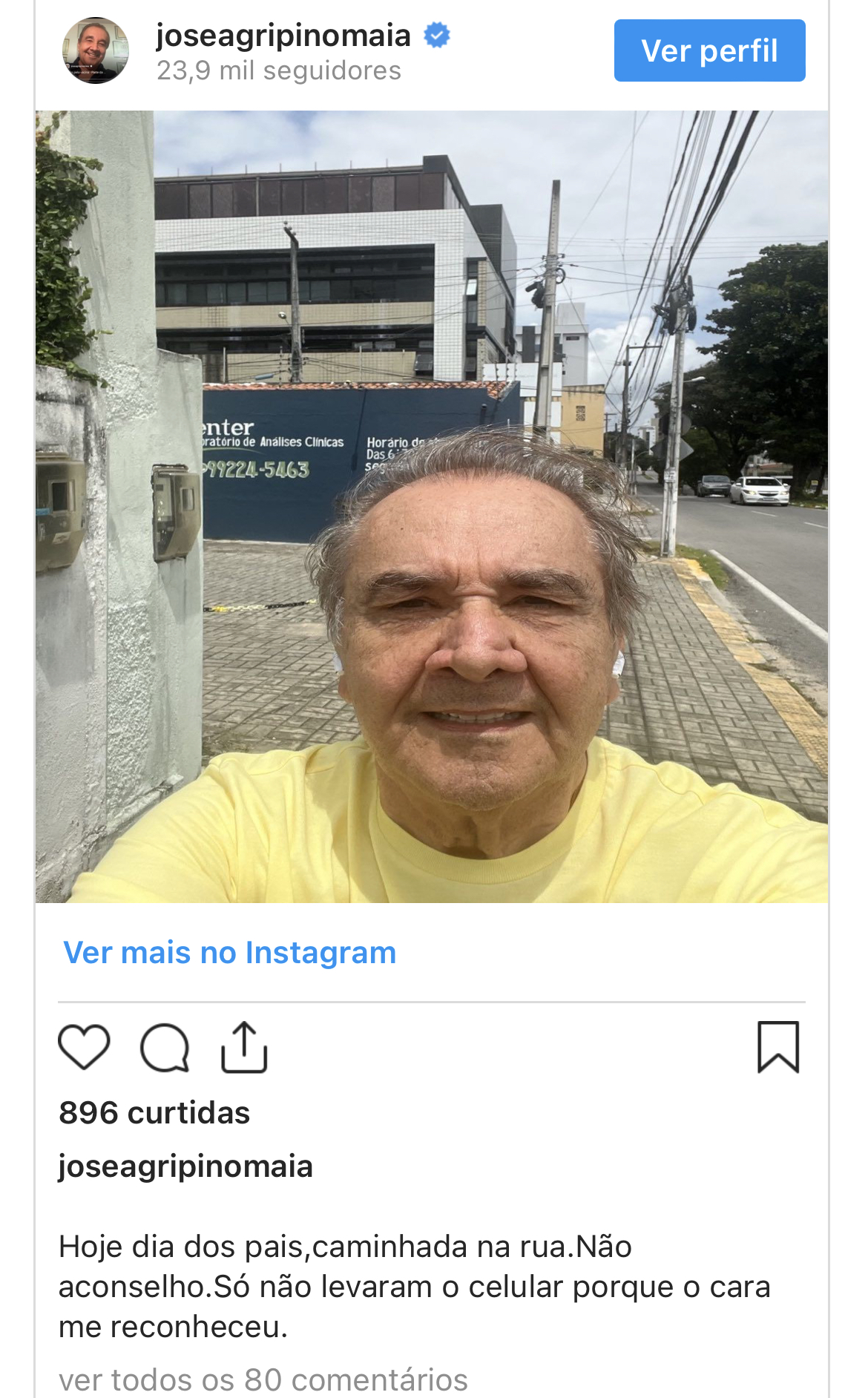 “Hoje dia dos pais, caminhada na rua. Não aconselho. Só não levaram o celular porque o cara me reconheceu.”, escreveu o ex-senador na publicação.
