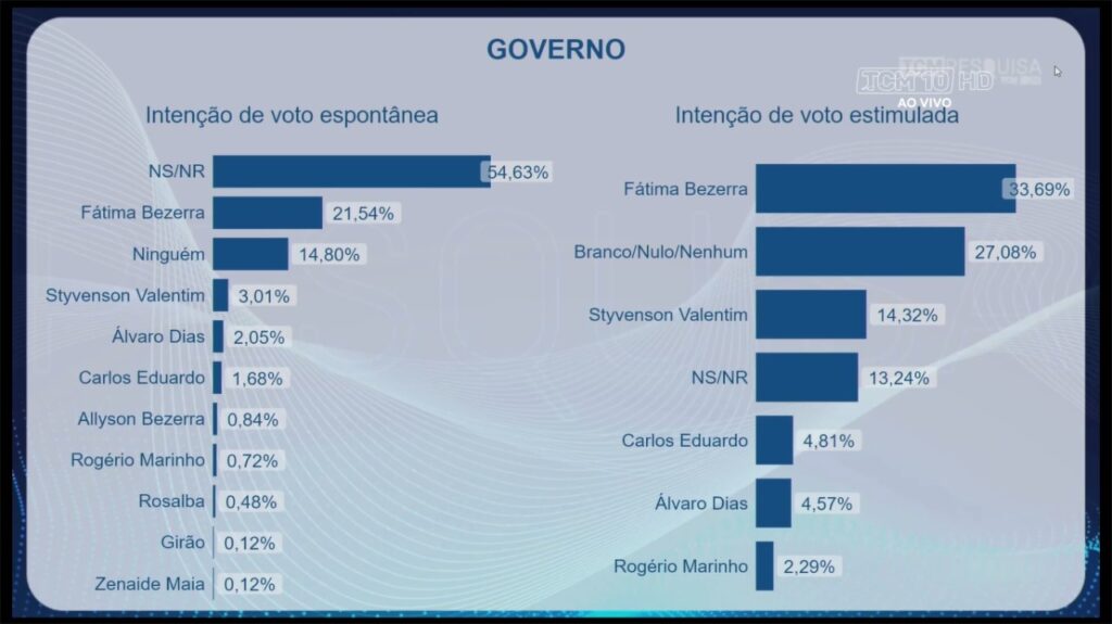 A governadora Fátima Bezerra (PT) tem a preferência dos mossoroenses na corrida eleitoral de 2022 para o Governo do Estado seguida pelo senador Styvenson Valentim (Podemos).