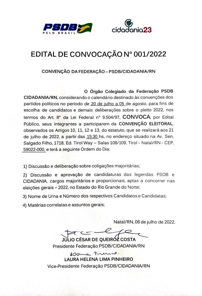 O colegiado da Federação PSDB Cidadania no Rio Grande do Norte publicou edital de convenção para a quinta-feira (21), na sede do PSDB Potiguar, que no Ed. Tirol Way, no bairro Tirol. Os dois partidos focam nas chapas proporcionais de deputado federal, onde apresentarão nove postulantes. Também apresenta 25 nomes de candidatos a Assembleia Legislativa, onde o PSDB tem hoje 50% da bancada dos 24 deputados.