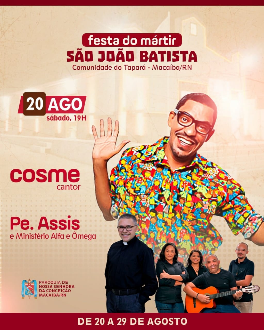 O cantor católico Cosme, reconhecido nacionalmente pelo tremendo testemunho de vida e missão, fará a abertura neste sábado (20), a partir das 20h, das festividades do padroeiro da comunidade de Lagoa do Tapará, em Macaíba, que acontece de 20 a 29 de agosto com missas e shows durante toda a festa.