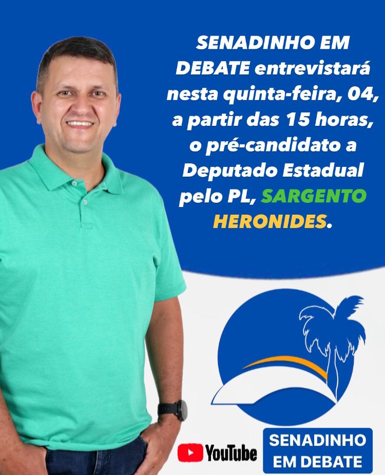 Nesta quinta-feira (4), a partir das 15h, o pré-candidato a deputado estadual, Heronides Mangabeira, pelo partido PL, será o entrevistado no programa Senadinho em Debate, com o publicitário André Arruda.