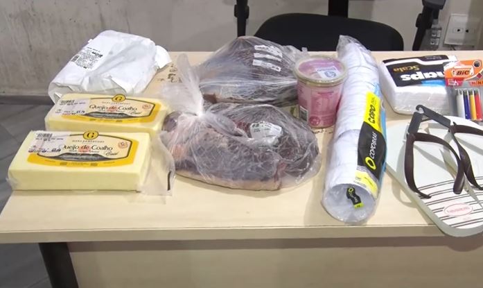 Entre os itens, segundo a polícia, estavam carnes, queijos, frango assado, copos descartáveis, guardanapos, isqueiros, além de outros produtos.