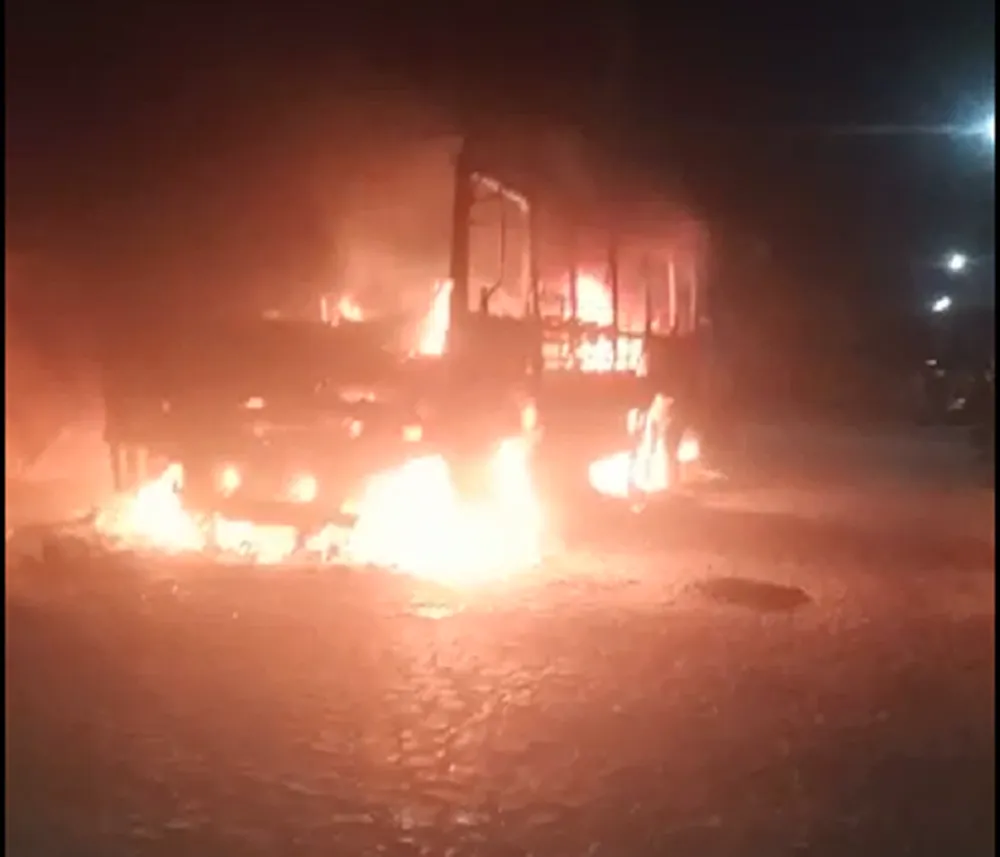 Um ônibus escolar foi destruído por um incêndio, na madrugada do domingo (9) em Baia Formosa, no Litoral Sul potiguar. As chamas também atingiram uma retroescavadeira.