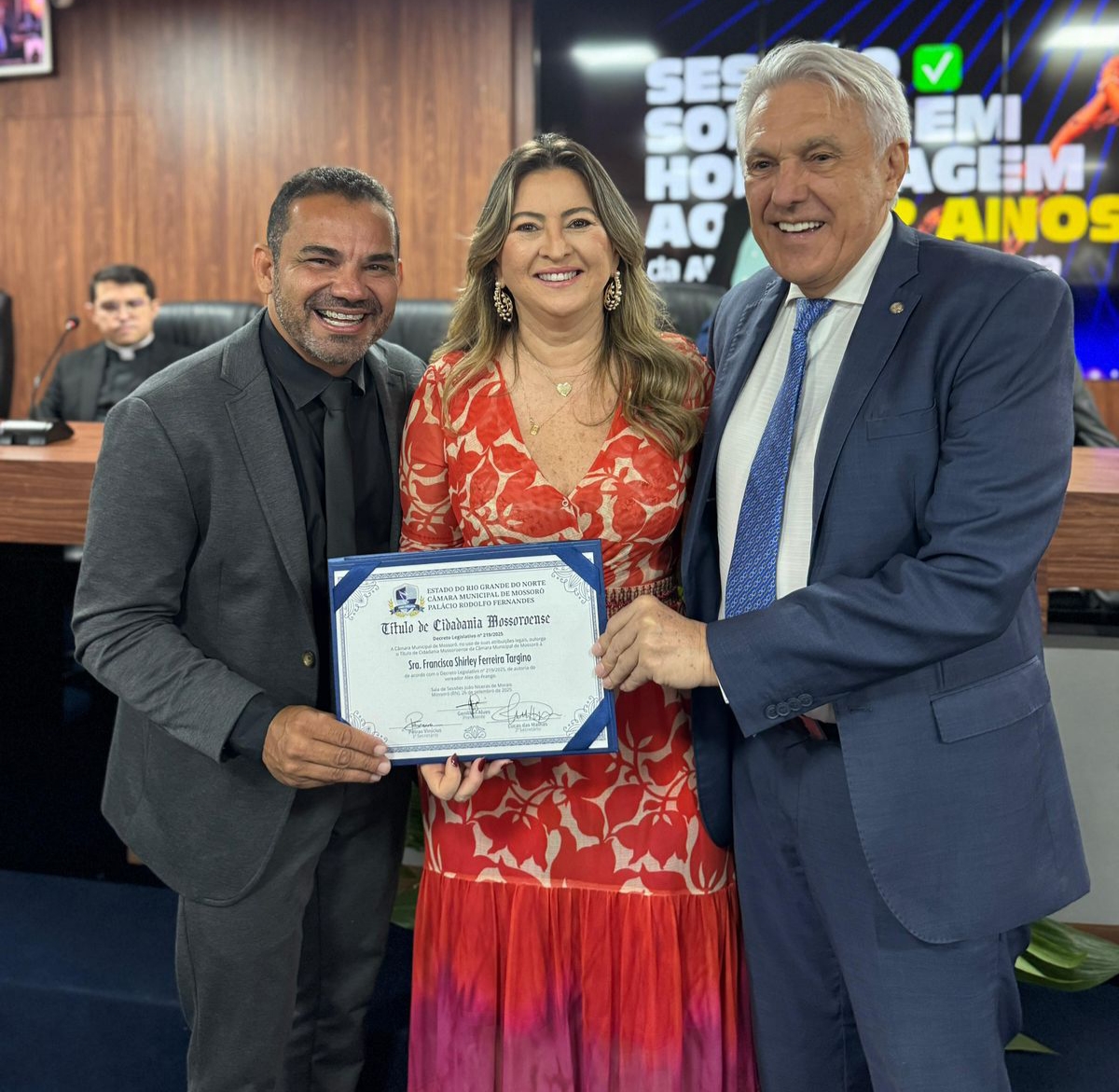 Entre os homenageados, a ex-prefeita de Messias Targino e atual secretária de Assistência Social de Mossoró, Shirley Targino, sua esposa, recebeu o título de Cidadã Mossoroense, em proposição do vereador Alex do Frango. A homenagem reconhece sua trajetória de serviços prestados à cidade e ao povo mossoroense.