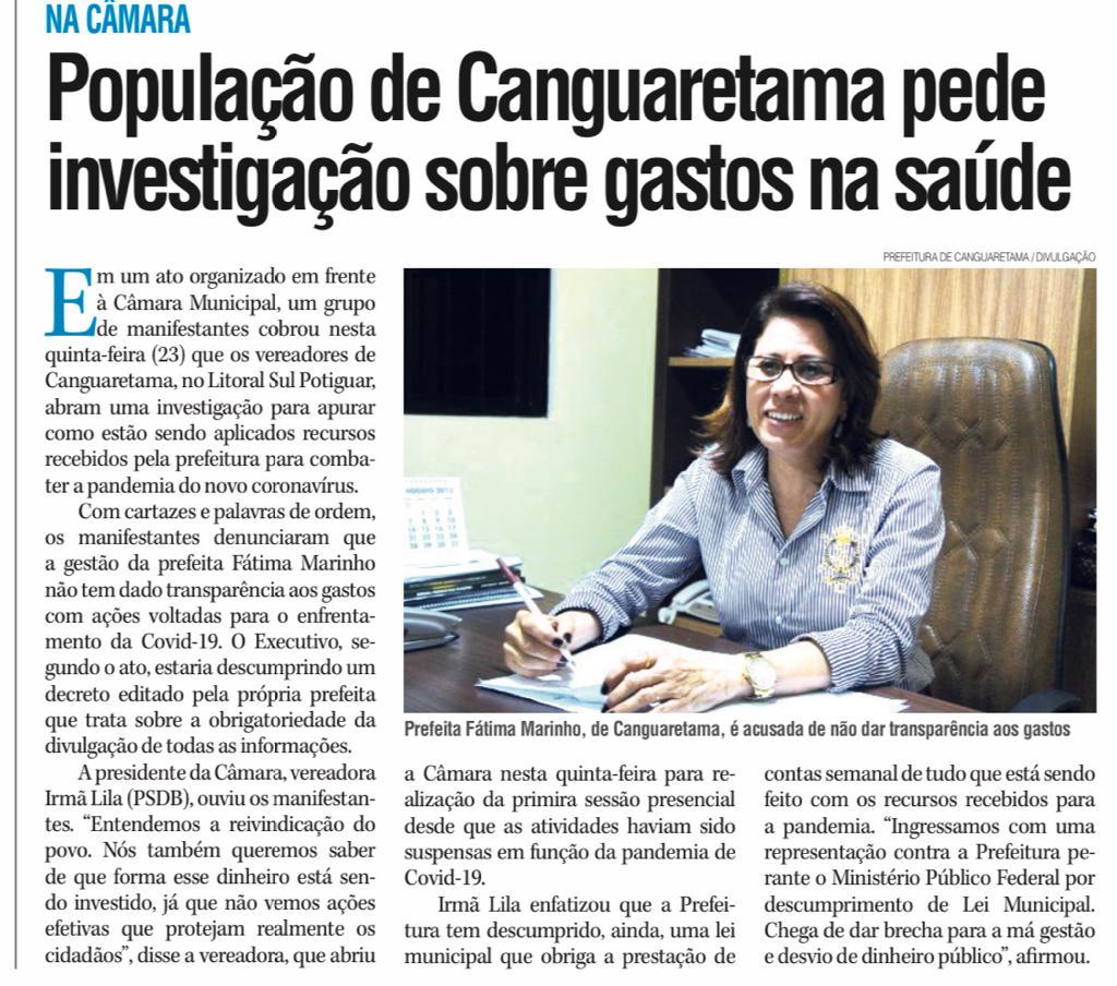 Há mais de 130 dias a Prefeitura de Canguaretama ignora a responsabilidade em relação à prestação de contas com os gastos da Pandemia pela Covid-19. A situação por lá parece estar fora do controle, já que a gestão da prefeita Fátima Marinho não está conseguindo nem ao menos cumprir o próprio Decreto Municipal, do último mês de junho, que obriga o Executivo apresentar informações das despesas com o combate a Pandemia.