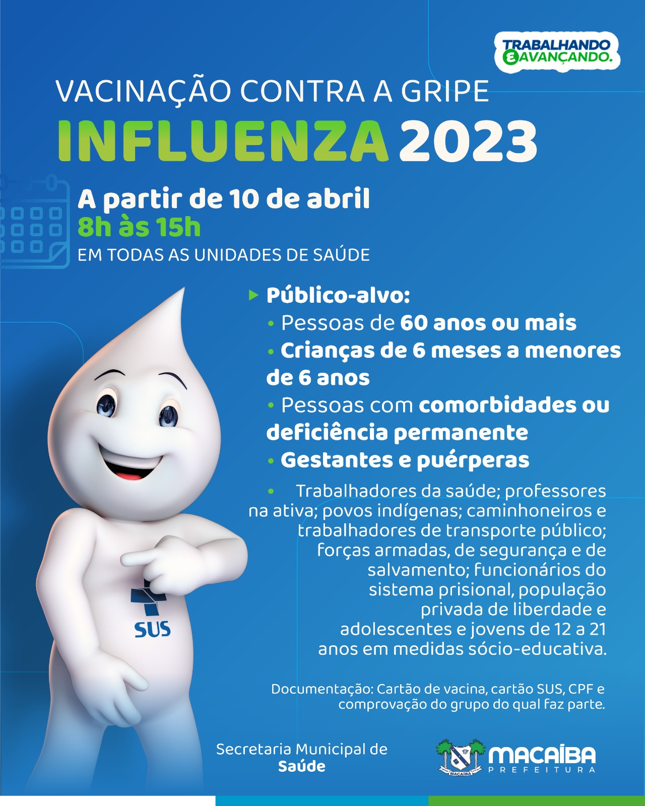 A Prefeitura de Macaíba, por meio da Secretaria Municipal de Saúde (SMS), inicia a campanha de vacinação contra a gripe (influenza) nesta segunda-feira (10) em todas as unidades básicas de saúde do município. O horário de atendimento à população nas unidades é das 8h às 15h.