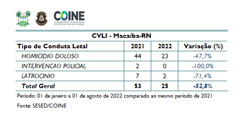 Dados apresentados pela Secretaria de Segurança Pública do Estado do Rio Grande do Norte (SEED/COINE) mostram a redução em Condutas Violentas Letais Intencionais em Macaíba, no período de 01 de janeiro a 01 de agosto de 2022 comparado ao mesmo período de 2021.