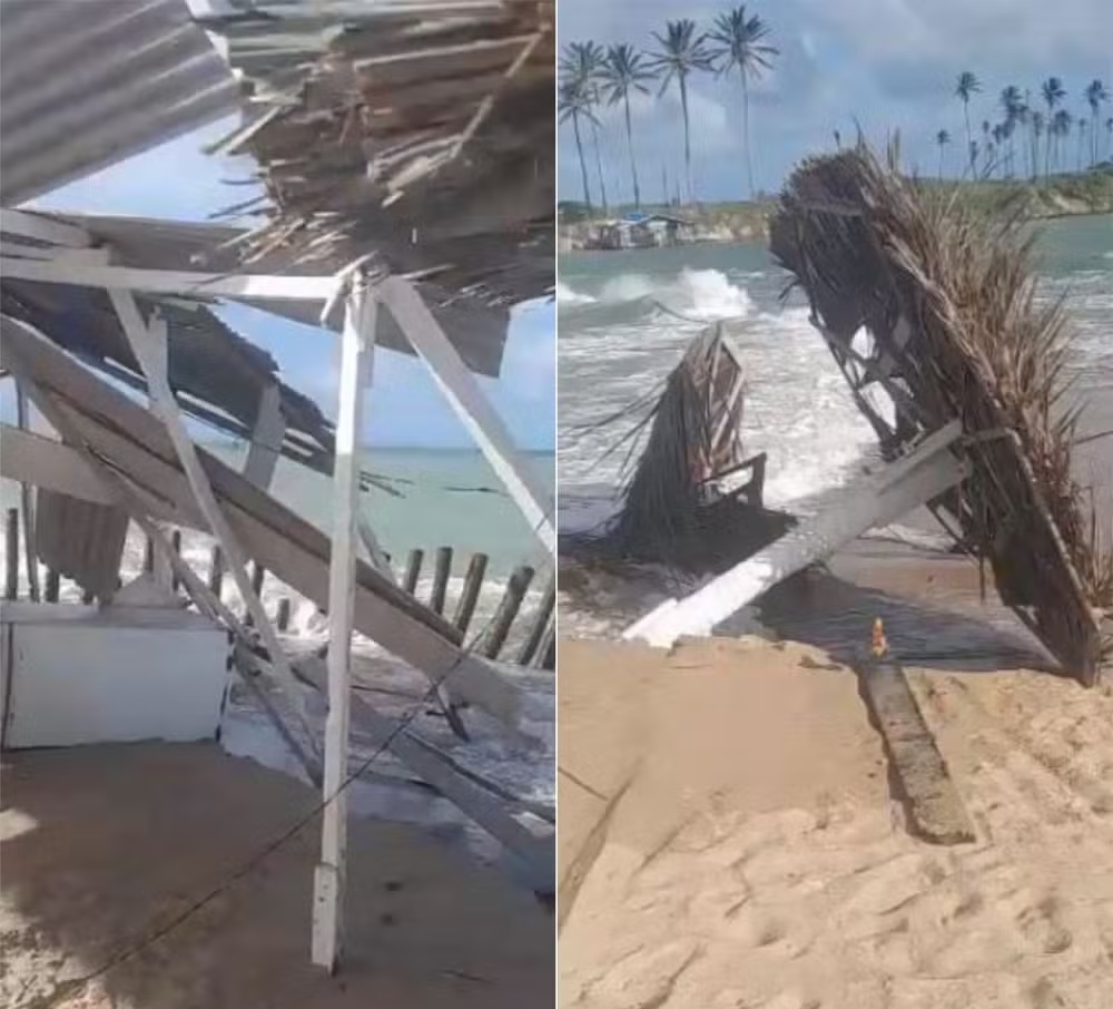 Mar avança e destrói barracas na orla de Maxaranguape, no litoral do RN