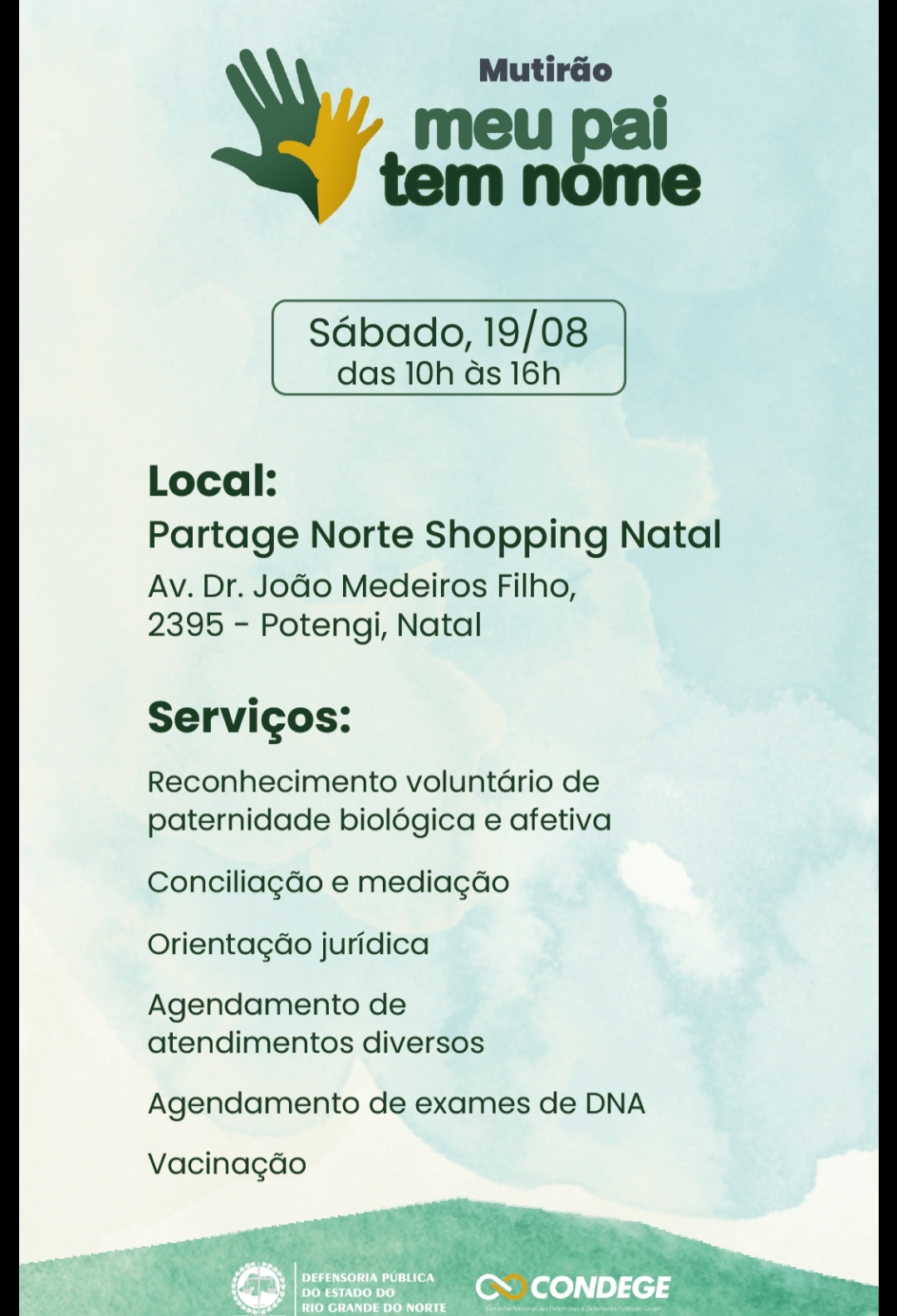 O Rio Grande do Norte realizou, em 2022, o registro civil de 2.184 crianças sem o nome do pai, apenas com o nome da mãe. O dado é da Associação Nacional dos Registradores de Pessoas Naturais (Arpen) e serviu como alerta para a Defensoria Pública do Estado que realizará a segunda edição do mutirão “Meu pai tem nome” para promover reconhecimentos de paternidade. A ação irá acontecer no dia 19 de agosto de 2023, das 10h às 16h, no Partage Norte Shopping, e terá agendamento para exames de DNA.
