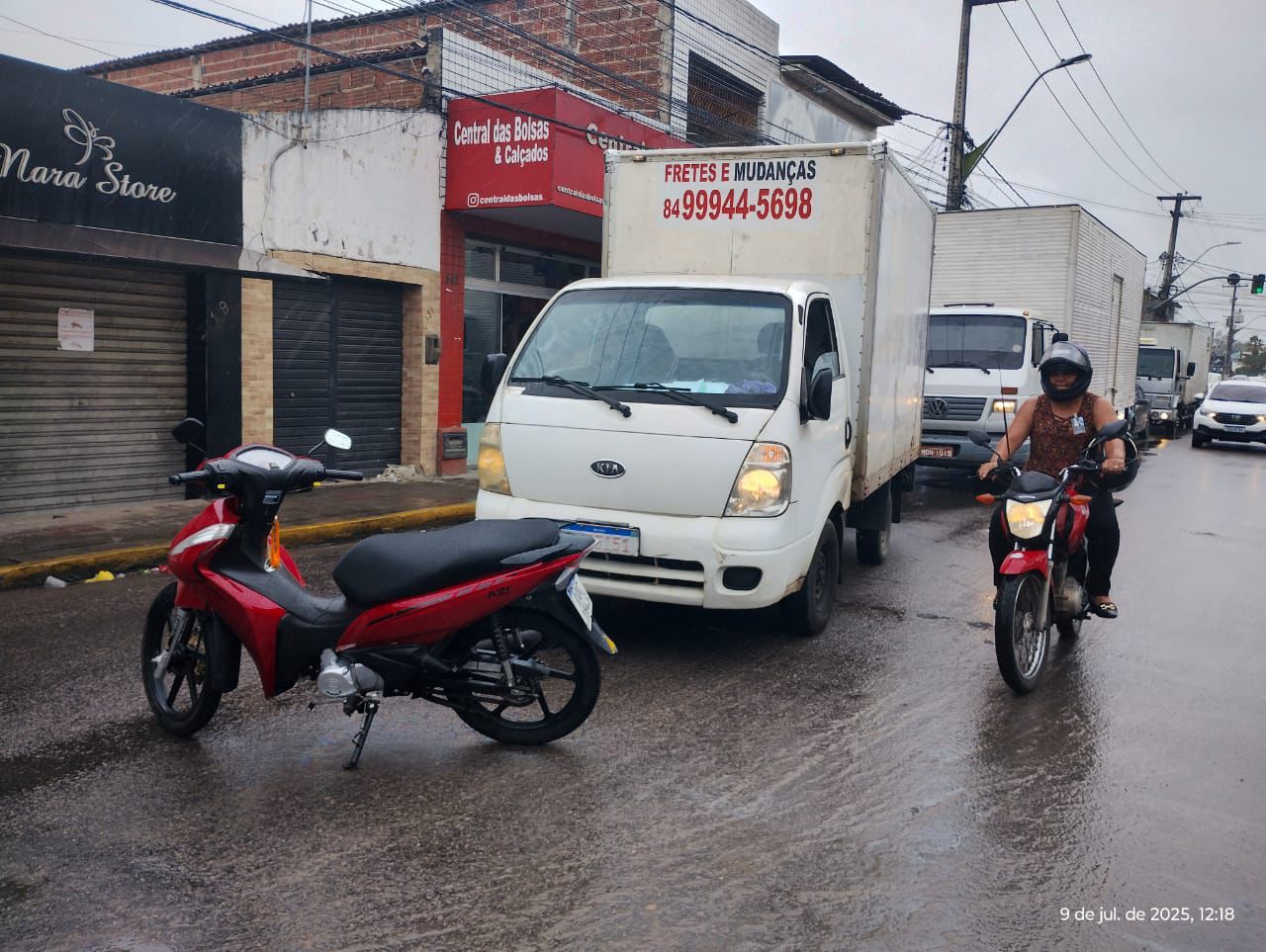Um acidente envolvendo uma motocicleta e um caminhão baú de pequeno porte foi registrado na manhã desta terça-feira (9), na Rua Professor Caetano, nas proximidades da Praça de Coló, no Centro de Macaíba.