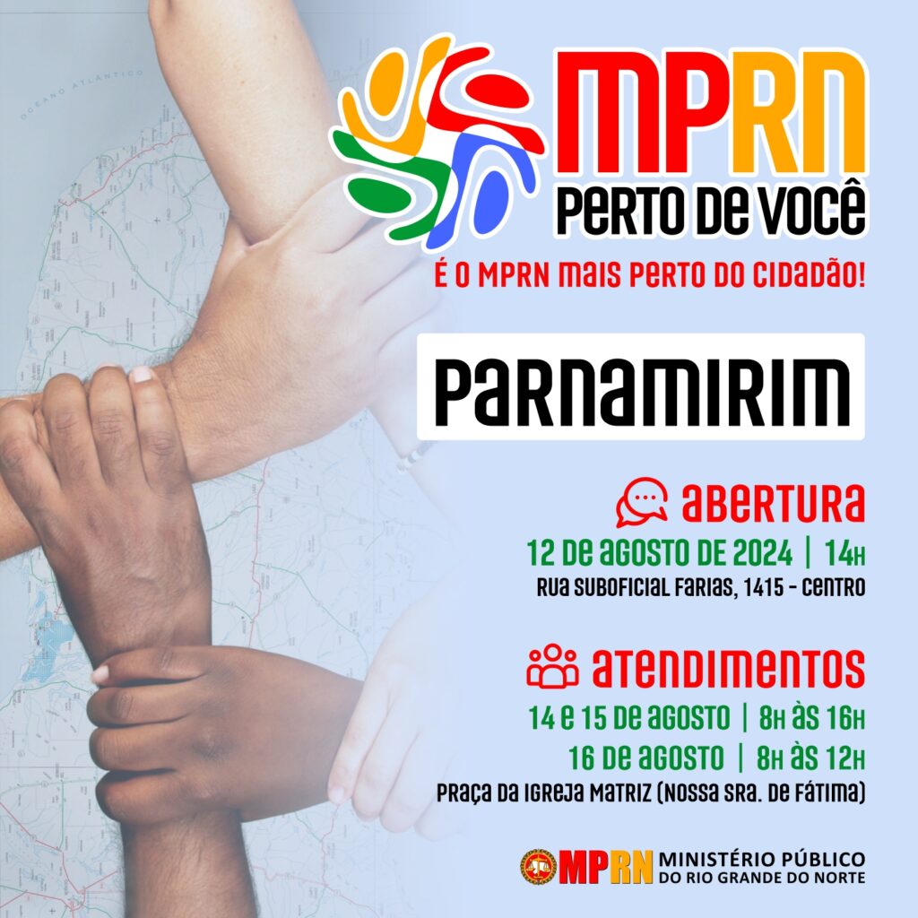 O Ministério Público do Rio Grande do Norte (MPRN) irá promover a VIII edição do projeto MPRN Perto de Você. O evento acontecerá entre os dias 12 e 16 de agosto no município de Parnamirim com ações de cidadania e atendimento ao público, buscando potencializar a atuação ministerial no âmbito da fiscalização e acompanhamento de políticas públicas.