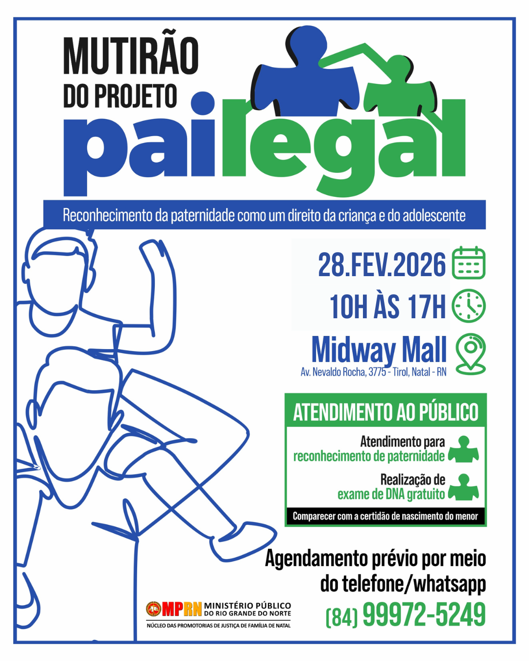 O Ministério Público do Rio Grande do Norte (MPRN) irá realizar o primeiro mutirão do ano de 2026 do Projeto Pai Legal. O evento de reconhecimento de paternidade acontecerá no dia 28 de fevereiro, das 10h às 17h, no 1º piso do Shopping Midway Mall, com oferta gratuita de exames de DNA. A ação terá vagas limitadas e quem deseja garantir o atendimento pode fazer o agendamento via whatsapp (84) 99972-5249.