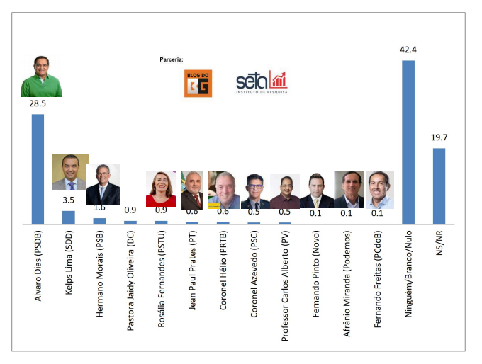 O Blog do BG divulga hoje a primeira das seis pesquisas eleitorais de Natal, em parceria com o instituto Seta, para o pleito desse ano analisando a corrida eleitoral para a Prefeitura. No quesito estimulado, ou seja, com o eleitor tendo acesso a uma lista em forma de disco com os nomes de todos os pré-candidatos postos, o prefeito Álvaro Dias aparece em primeiro com 28,5% das intenções de voto.