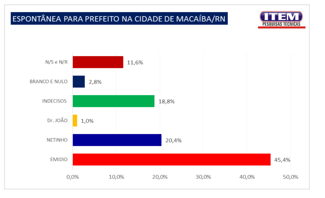 A Pesquisa Item na espontânea aponta o prefeito de Macaíba, Emídio Júnior, com 45,4% das intenções de voto; Netinho França 20,4%, e Dr. João 1,0%; 18,8% indecisos; 2,8% branco ou nulo e 11,6% não sabem ou não responderam .