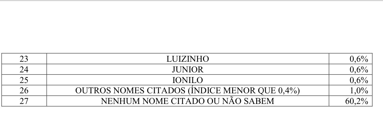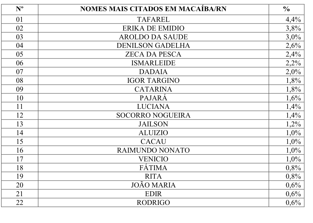 A pesquisa Item de intenção de voto para vereador aponta os nomes mais citados: Tafarel com 4,4%; Érika Emídio com 3,8%; Aroldo da Saúde com 3,0%; Denilson Gadelha com 2,6%; Zeca da Pesca 2,4%; Ismarleide 2,2%; Dadaia 2,0%; Igor Targino 1,8%; Catarina 1,8%; as demais citações no gráfico acima.