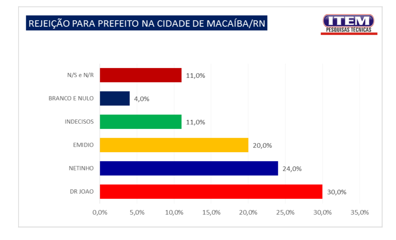 Pesquisa Item/Macaíba/rejeição: Dr. João 30,0%; Netinho França 24,0% e Emídio Júnior 20,0%