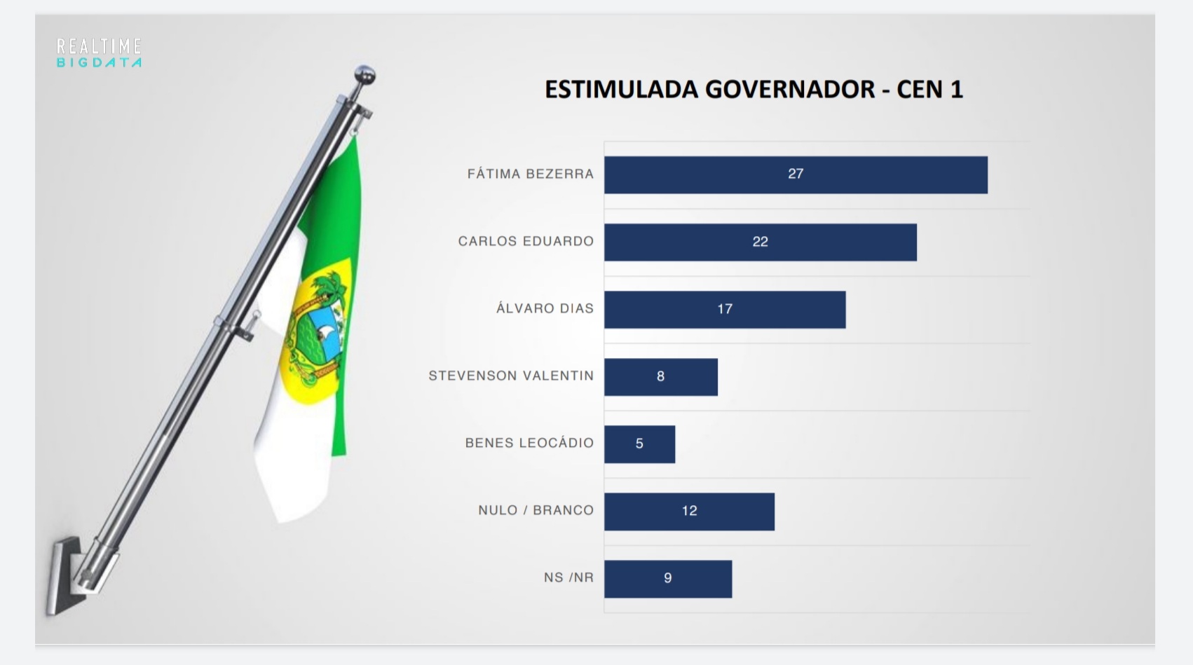 Na disputa pelo Governo do Estado, a governadora Fátima Bezerra (PT) lidera com 27%, seguida por Carlos Eduardo (PDT) 22% e Álvaro Dias (PSDB) com 17%. O senador Styvenson Valentim surge com 8%, enquanto o deputado federal Benes Leocádio (Republicanos) tem 5%. Nulos e brancos ficaram com 12%, enquanto 9% não souberam responder.