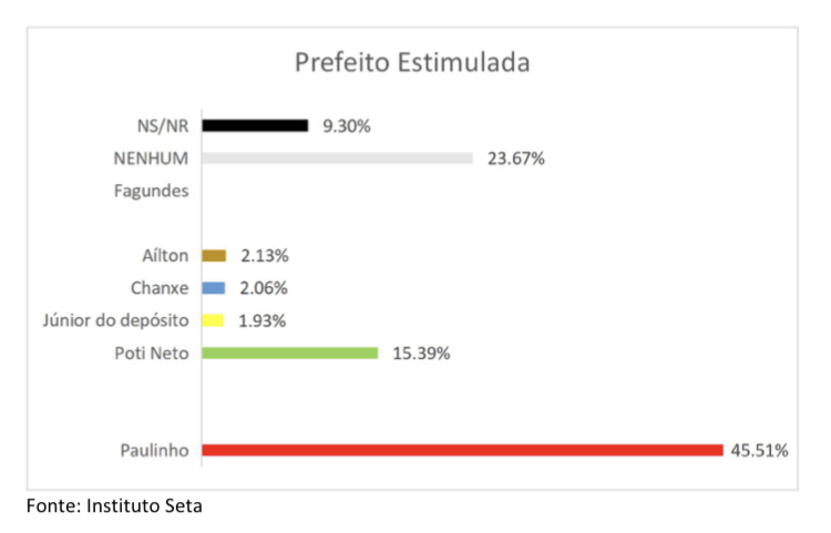 O pré-candidato Poti Neto é o segundo com 15,39% e os demais nomes não atingiu à margem de erro. Outros 23,67% afirmaram não votar em qualquer dos candidatos.