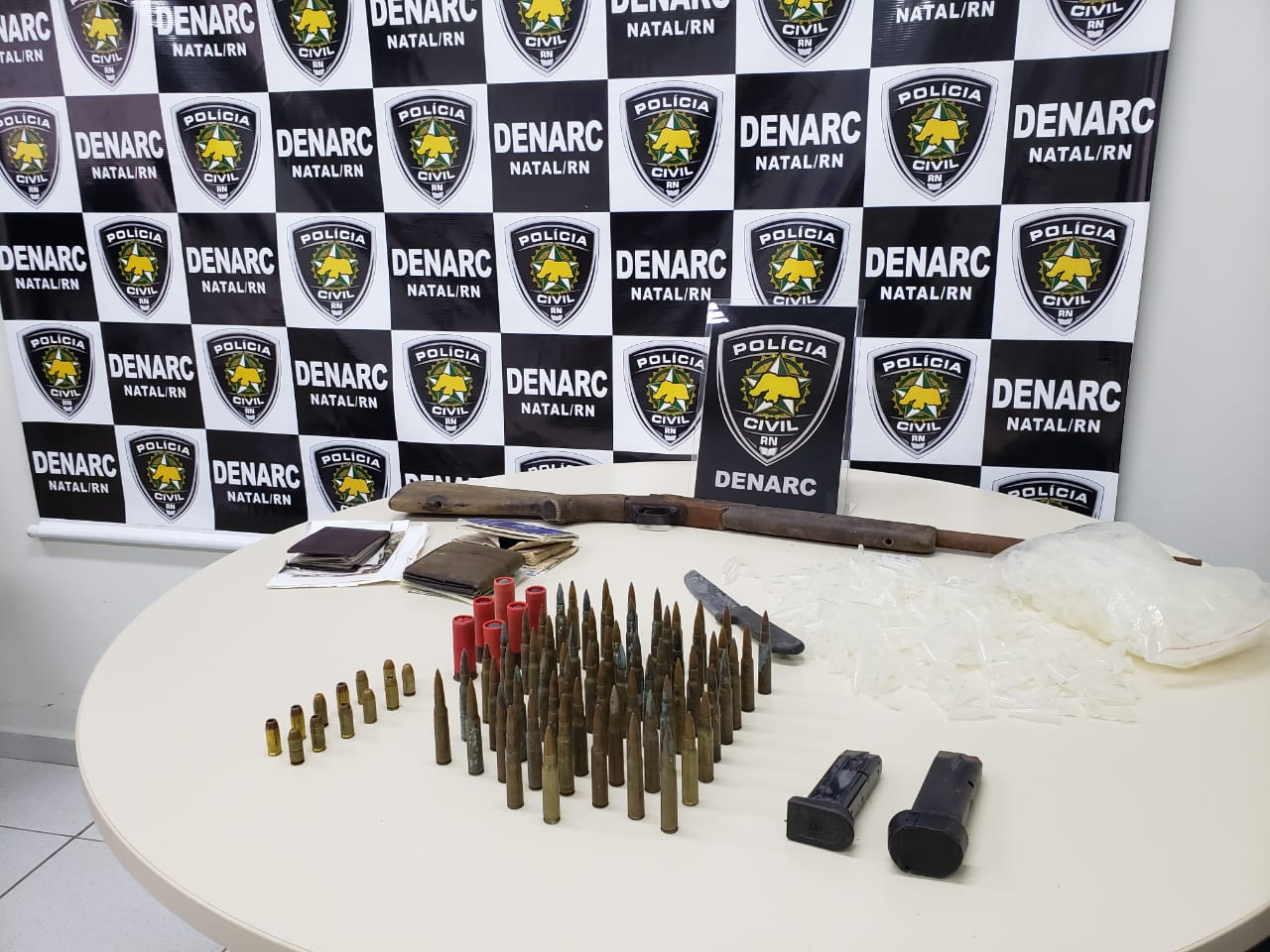 Policiais civis da Delegacia Especializada de Narcóticos (DENARC) de Natal, com apoio da Delegacia Especializada de Capturas (DECAP), apreenderam, na manhã desta segunda-feira (09), uma espingarda calibre 12, 12 munições .40, 66 munições de fuzil calibre 7.62, seis munições de calibre 12, além de dois carregadores, ambos de pistolas calibres .40 e .380.