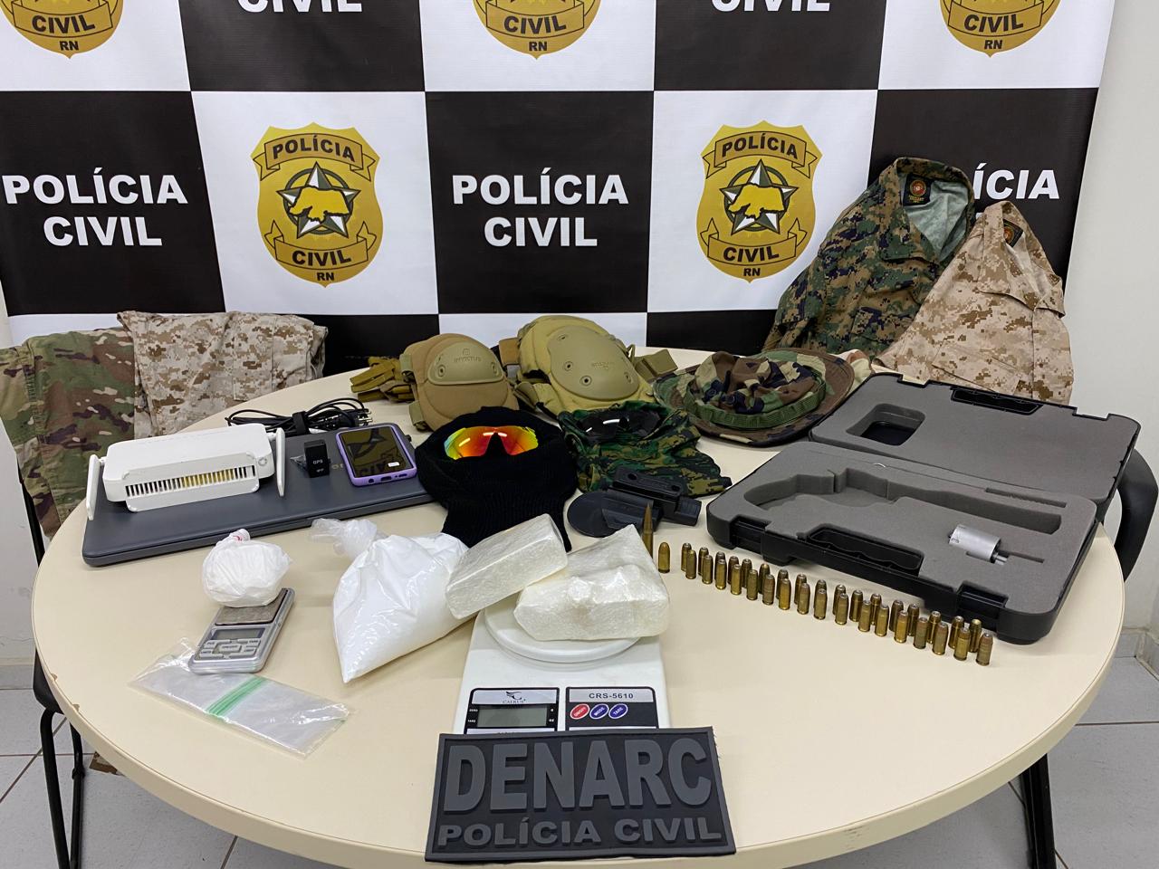 Além dos demais objetos e entorpecentes encontrados na residência, também foram apreendidos roupas táticas, por vezes utilizadas para roubos e ações criminosas, como coldres, balaclavas, gandolas, calças camufladas, óculos com lentes de proteção e chapéus. Os materiais foram conduzidos à DENARC/Natal, onde prosseguirá as investigações para responsabilização dos envolvidos.