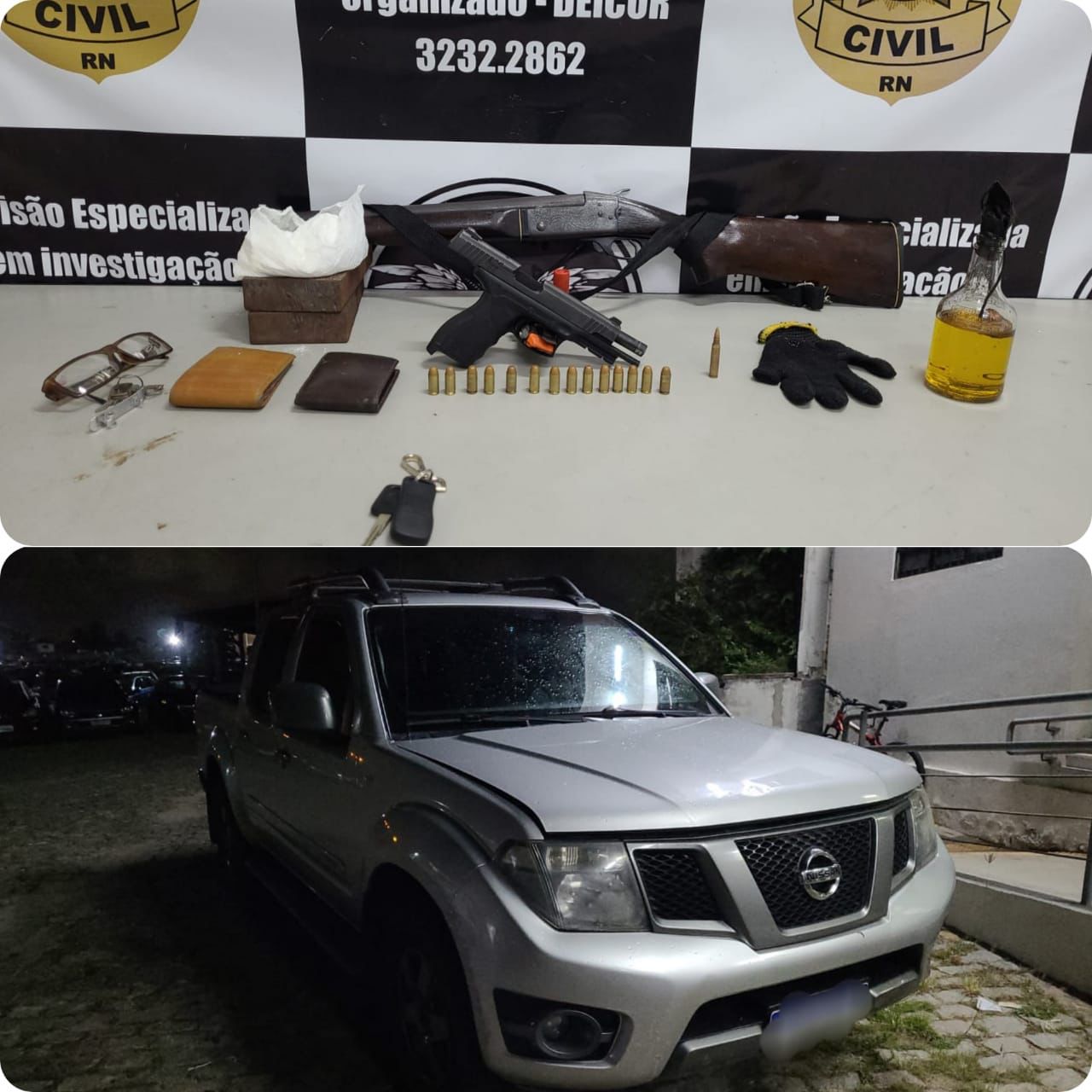 PC/SECOMS – Policiais Civis da Divisão Especializada em Investigação e Combate ao Crime Organizado (DEICOR), com apoio da Polícia Rodoviária Federal (PRF), nesta terça-feira (03), deram continuidade às diligências visando efetuar as prisões dos suspeitos de atuarem na explosão que possibilitou o roubo a um cofre de um banco no município de Santo Antônio do Salto da Onça. Os suspeitos, detidos por volta das 21h, na Avenida Senador Salgado Filho, zona sul de Natal, foram autuados por organização criminosa, porte ilegal de arma de fogo, tráfico de drogas, receptação e uso de documento falso.