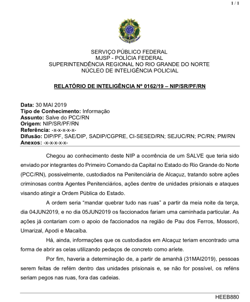 O núcleo de inteligência da Polícia Federal elaborou um relatório em que alerta para o risco de um “salve” da facção Primeiro Comando da Capital (PCC) no Rio Grande do Norte, na próxima terça-feira (4). O documento foi revelado Blog do Negreiros.