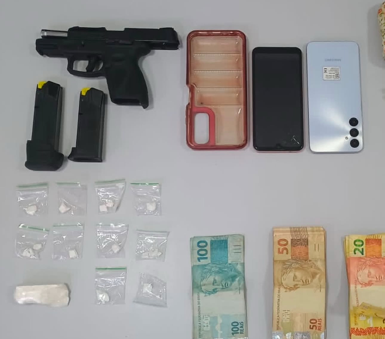 Em patrulhamento na cidade de Macaíba, por volta das 23h30, no bairro Campo das Mangueiras, a viatura B1110, com apoio de outras viaturas da área, apreenderam uma pistola 9mm, 24 munições 9mm, 1 porção média de substância análoga a cocaína, além de 10 embalagens ziplock contendo substância análoga a cocaína, R$ 2.565,00 em espécie, e dois celulares.