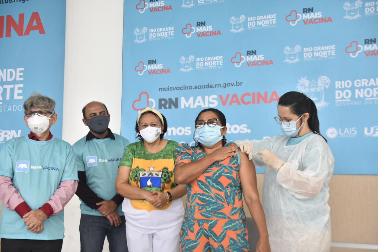 A Campanha Estadual de Vacinação contra a Covid-19 iniciou no dia 19 de janeiro, quando a técnica em enfermagem Maria das Graças Pereira de Oliveira, 57 anos, do Hospital Giselda Trigueiro, recebeu a primeira dose da Coronavac/Butantan. “Depois de ver tanto sofrimento de perto, a vacina chegou a ser um sonho pra gente e hoje é a esperança de que vai dar tudo certo. Uma felicidade muito grande”, celebrou Maria na cerimônia de abertura da campanha. Na madrugada daquele dia, o Rio Grande do Norte havia recebido o primeiro lote de vacinas com 82.440 doses da Coronavac.