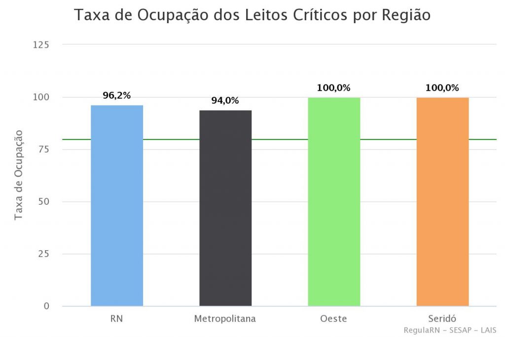 Segundo a Sesap, a Região metropolitana apresenta 94% dos leitos críticos ocupados, a região Oeste tem 100% e a Região Seridó tem 100%.