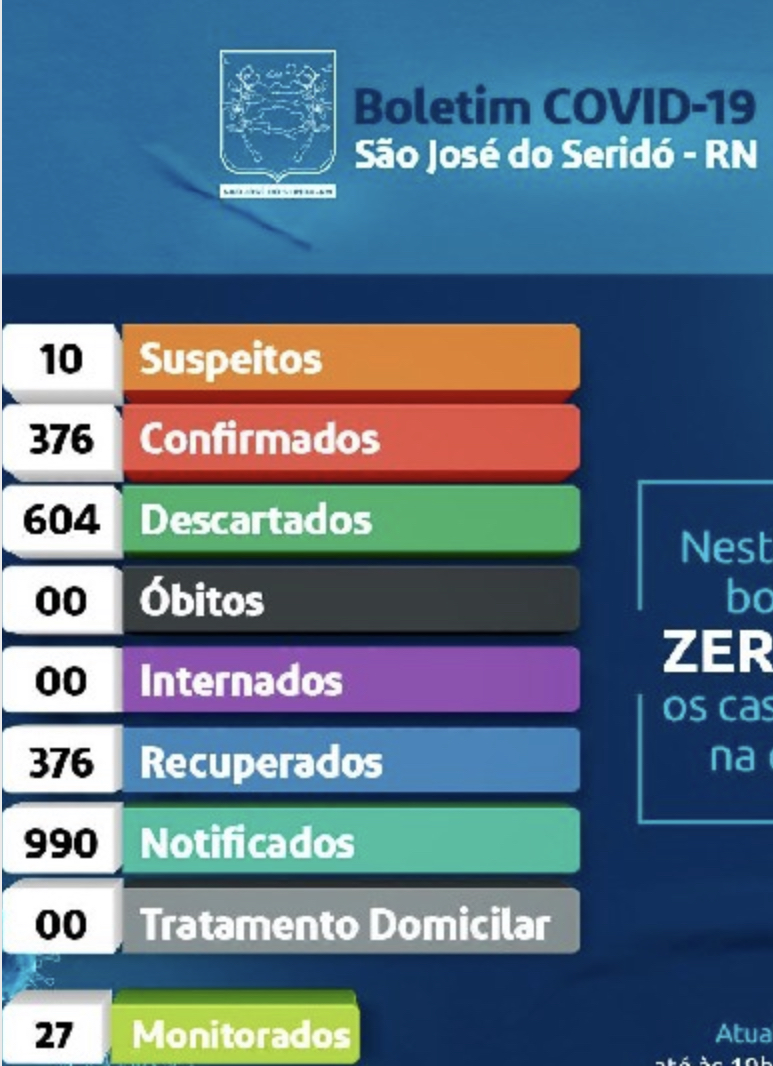 O número de são-josé-seridoenses recuperados soma 376. Existem 27 pessoas sendo monitoradas no momento. Casos monitorados são de pessoas que tiveram algum tipo de contato com terceiros que testaram positivo para a COVID-19.