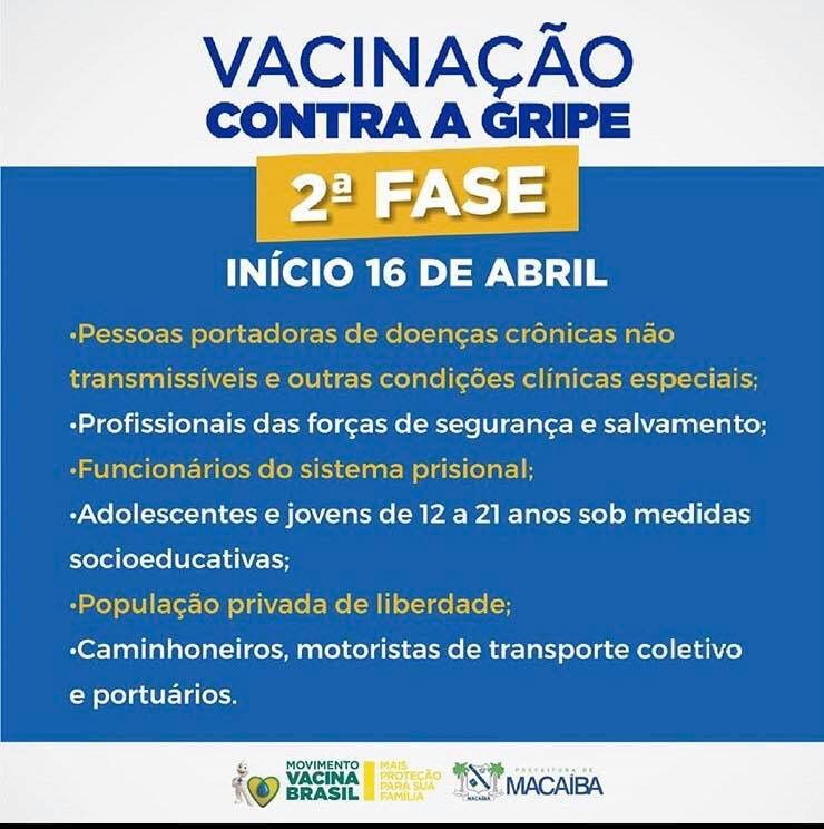 Macaíba Informe Publicitário: Segunda fase da campanha contra a gripe Influenza começa nesta quinta-feira (16) em Macaíba 15/04/2020 Administrador A segunda fase da campanha contra a gripe Influenza começa nesta quinta-feira (16), em todas as Estratégias de Saúde da Família de Macaíba. Confira quais são os grupos prioritários. Assecom-PMM Spread the love