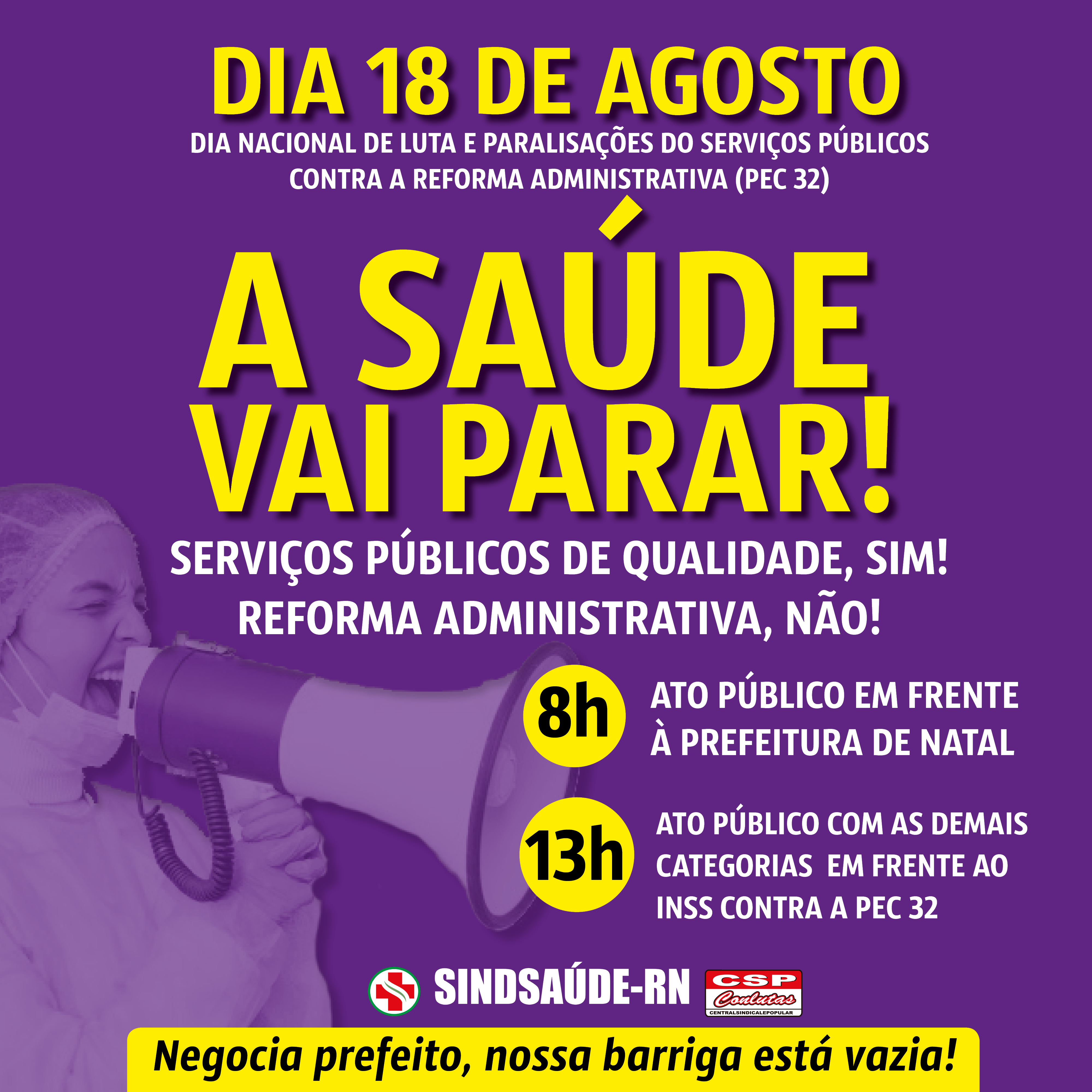 Os servidores da saúde do estado e do município de Natal vão paralisar suas atividades nesta quarta-feira (18). A data faz parte do Dia Nacional de Luta e Paralisações dos serviços públicos contra a reforma Administrativa (PEC 32) do Governo Bolsonaro.