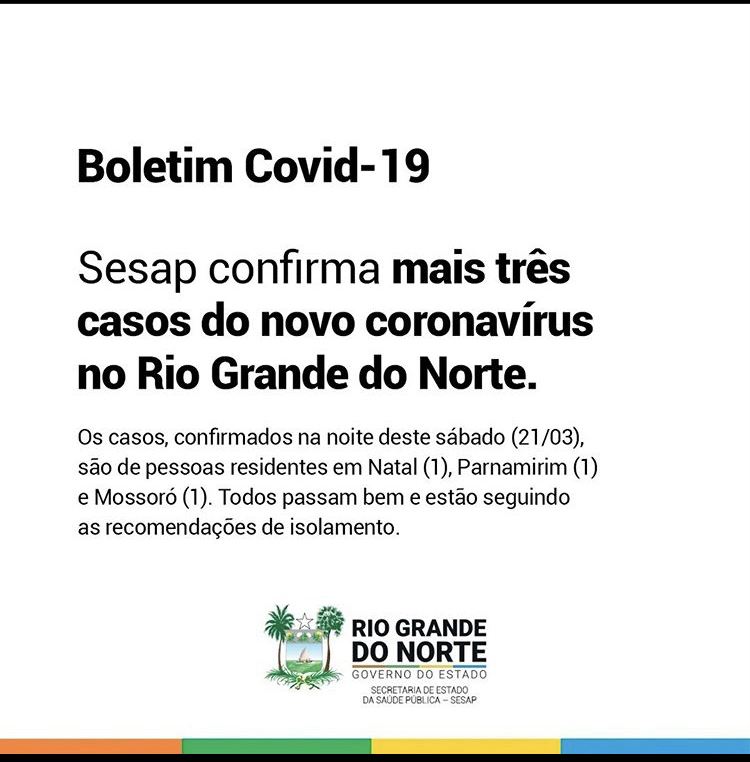 As amostras foram processadas pelo Laboratório Central do RN e os casos são de residentes dos municípios de Natal, Parnamirim e Mossoró. Todos passam bem e estão seguindo as recomendações de isolamento preconizadas.