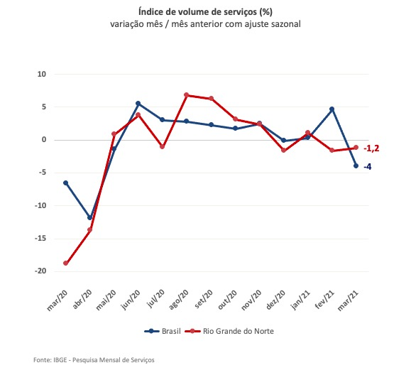 Na comparação com o mesmo mês do ano anterior, março de 2021 superou o volume de serviços de março de 2020 em 2,1%. Esse é o primeiro resultado positivo em 12 meses no estado potiguar. Vale lembrar que, em março de 2020, houve o início das medidas de isolamento social para conter a covid-19 em todo o Brasil.