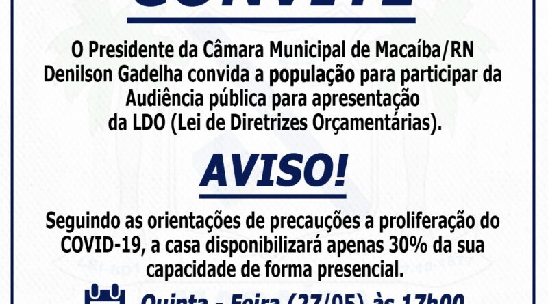 Read MoreAmanhã (27), será realizada a audiência pública da apresentação da LDO, na Câmara Municipal de Macaíba.