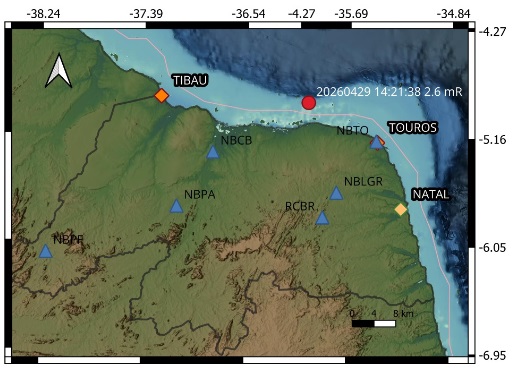 Um tremor de terra de magnitude 2,6 foi registrado na Margem Equatorial, no litoral do Rio Grande do Norte, em ponto próximo ao município de Caiçara do Norte. De acordo com o Laboratório de Sismologia da Universidade Federal do RN (Labsis/UFRN), o terremoto aconteceu nessa quarta-feira (29), às 11h21 (horário de Brasília).