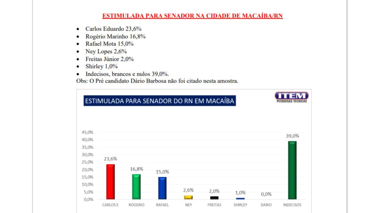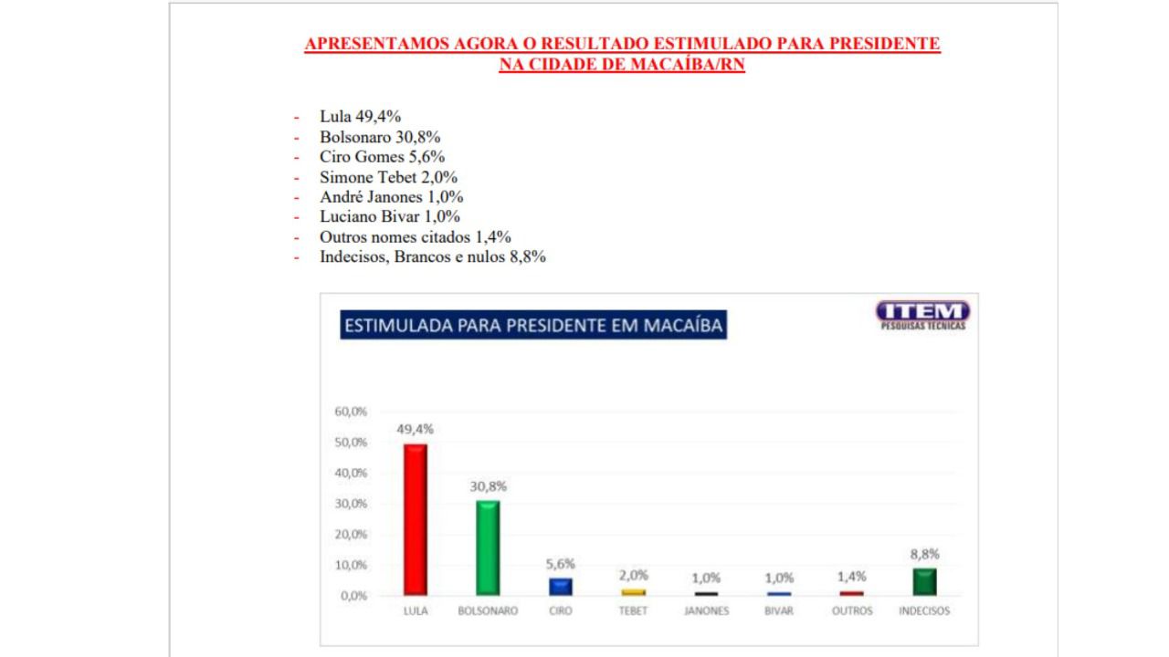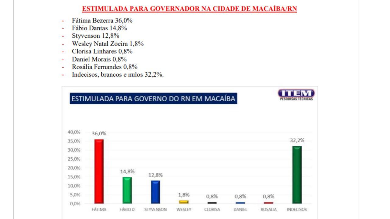 A empresa de pesquisas ITEM Pesquisas Técnicas realizou coleta de informações sobre a intenção de votos exclusivamente no município de Macaíba. A pesquisa sondou os eleitores quanto à preferência para presidente, governador, senador, deputado federal e deputado estadual.