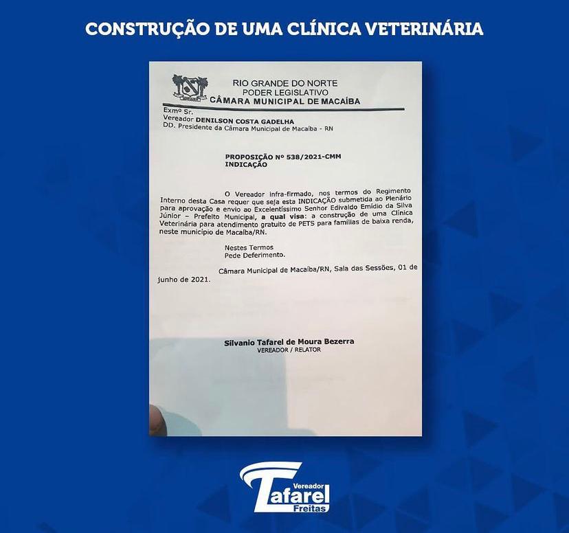 Na sessão da última terça-feira, dia 1, apresentei o requerimento Nº 538/2021, que prevê a construção de uma clínica veterinária municipal, voltado ao atendimento gratuito de cachorros, gatos e outros animais. Que oferecerá todos os procedimentos necessários para o tratamento do animal, incluindo também vacinações, remédios, castração permanente, exames e pequenas cirurgias.